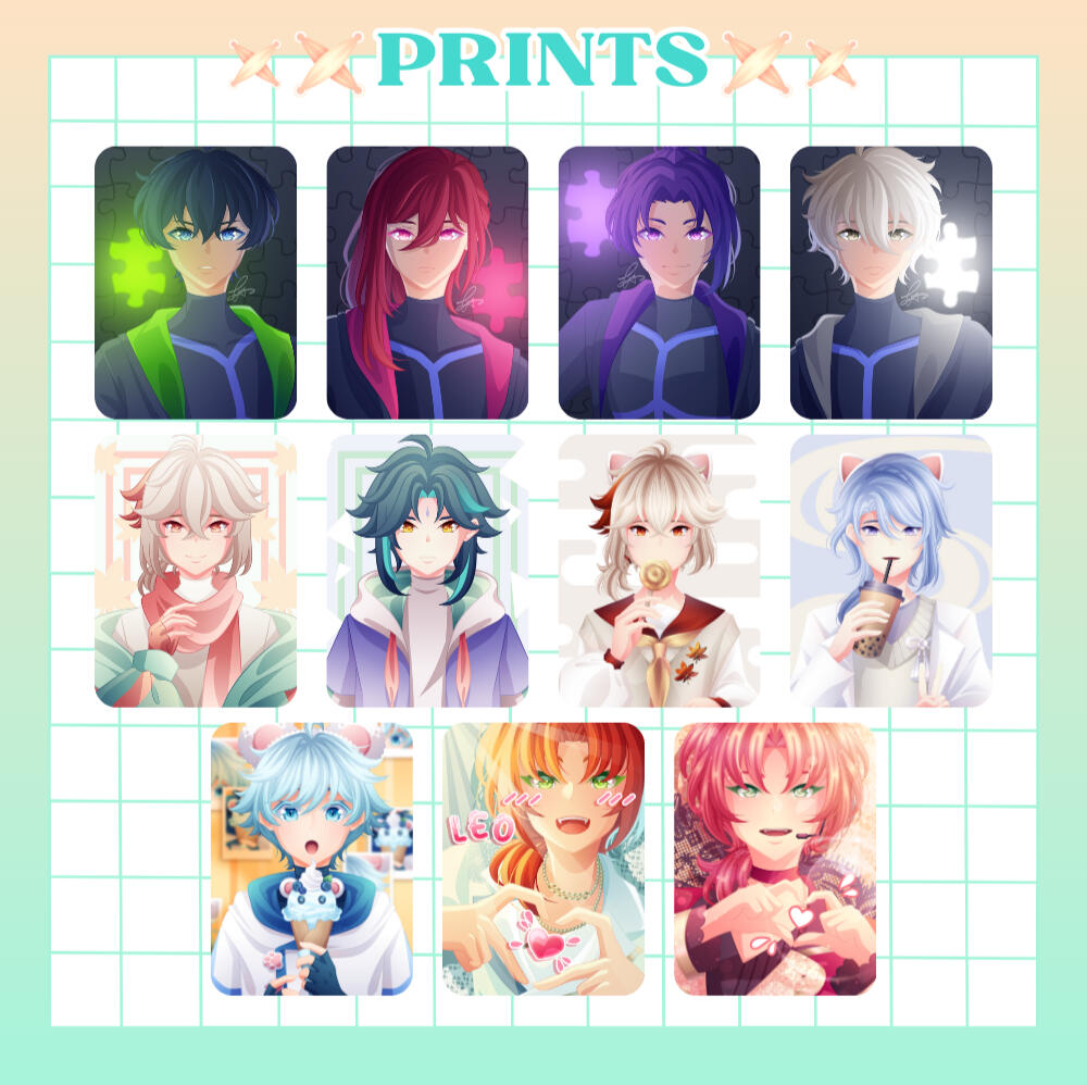 Art by Ayu carries a variety of cute merch such as prints, stickers, and photocards from popular games like Genshin Impact, Honkai: Star Rail, Ensemble Stars, Love and Deepspace, and Cookie Run: Kingdom.